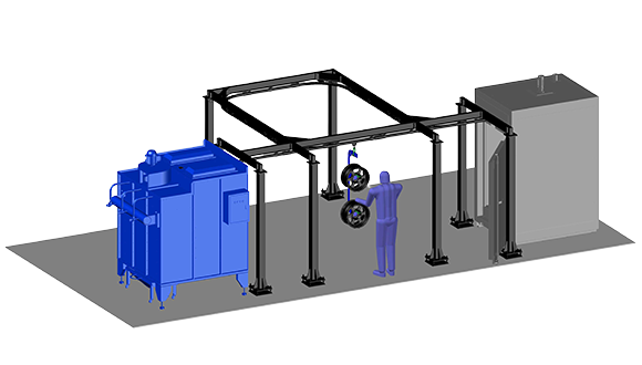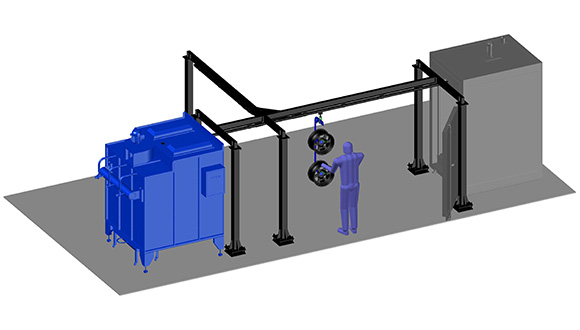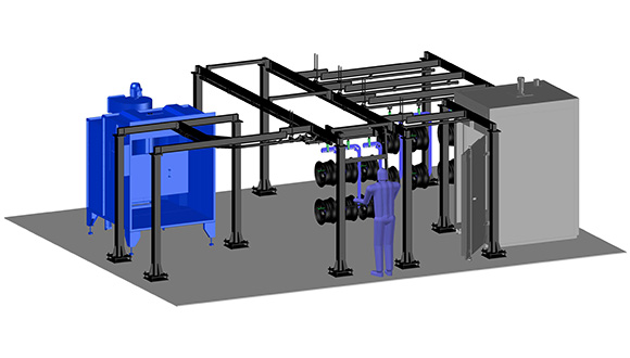 Schon bei kleineren Stückzahlen bieten unsere Schienensysteme für Pulverbeschichtung eine deutliche Arbeitserleichterung für die Mitarbeiter, indem sie den Materialfluss zwischen Pulverkabine, Einbrennofen und Kühlzone optimieren.